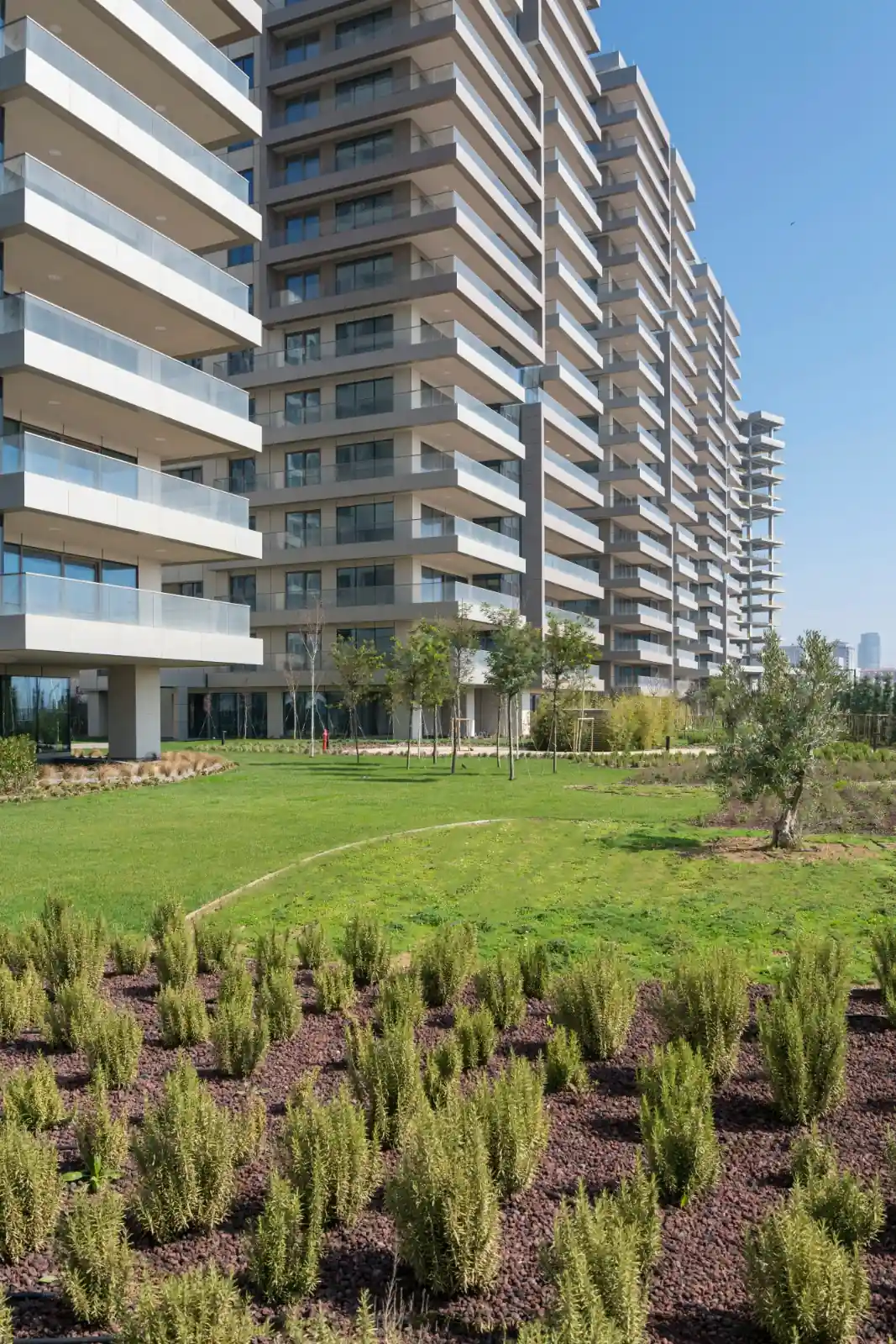 The facade features large glass windows, wide balconies, and high-quality materials. Each building is thoughtfully positioned to allow for optimal sea exposure while maintaining privacy between units. The overall design is clean, minimalistic, and timeless—ideal for modern urban living by the sea.
